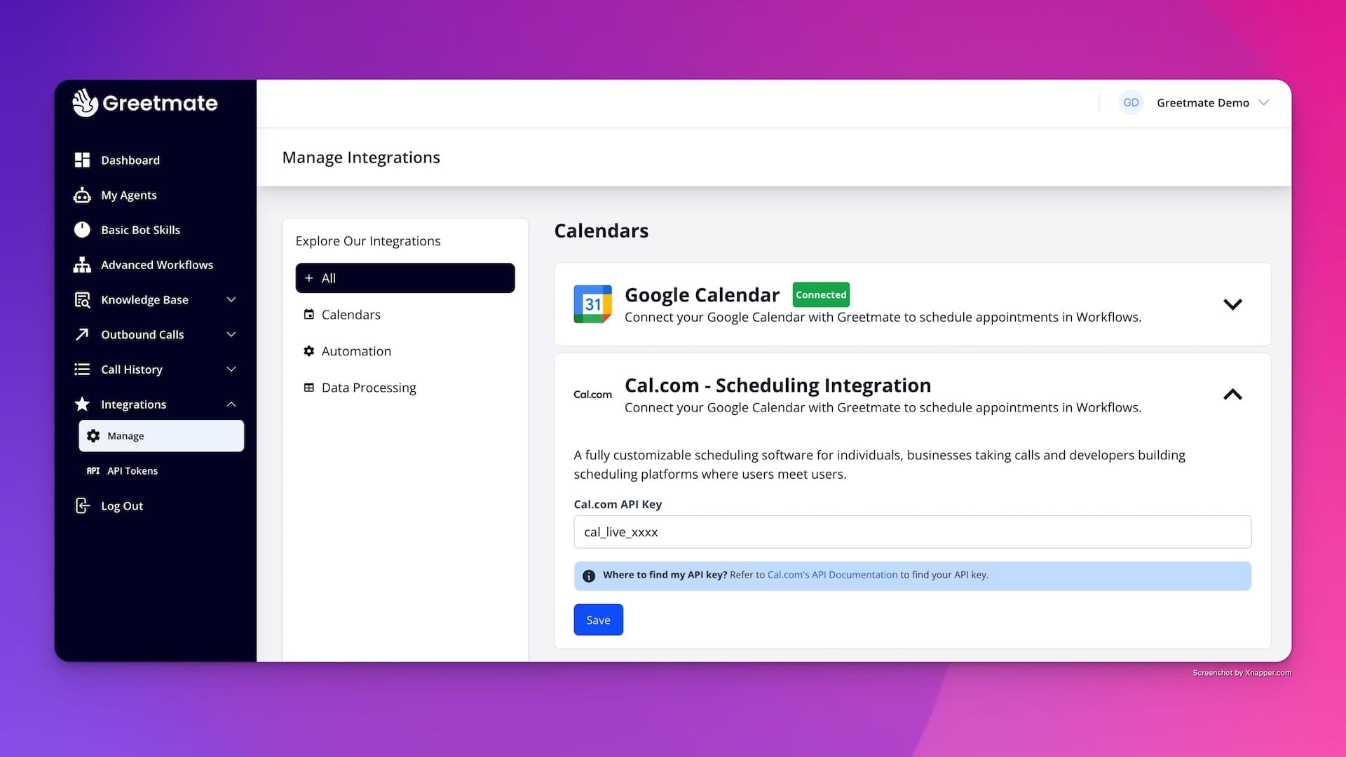 Connect Cal.com to Greetmate.ai and enable appointment scheduling for your AI agents.